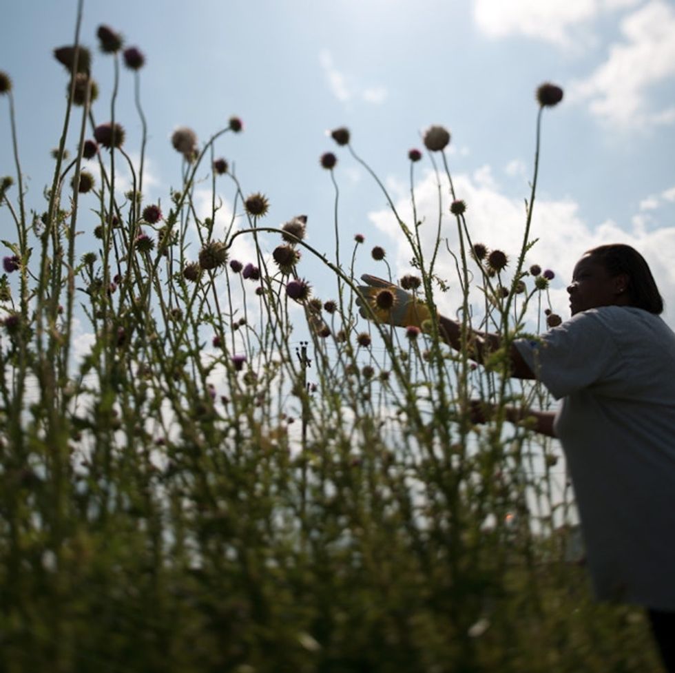 “They're considered a noxious weed, but they can grow through concrete; through chain-link fences," says Stevens. "They are determined and dogged to bloom. They're just like the women. They're just like me. They're survivors."
