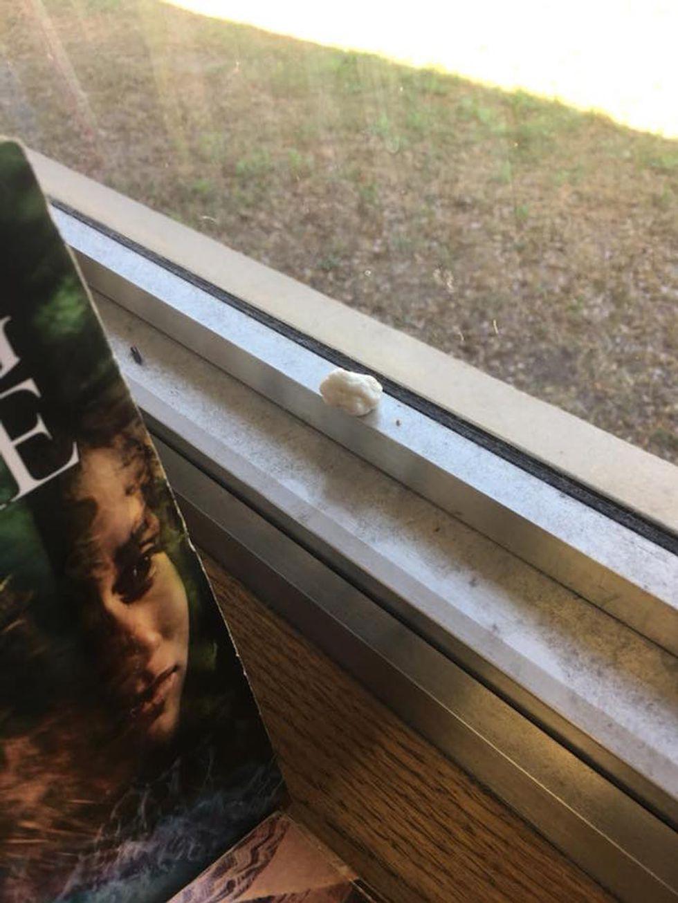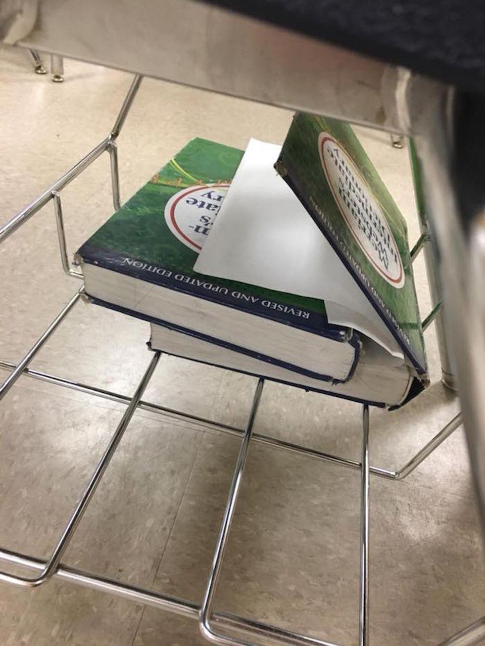 Marburger included these photos of her classroom in disarray, including torn up text books, broken bookshelves, and a piece of chewed-up gum stuck to a window.