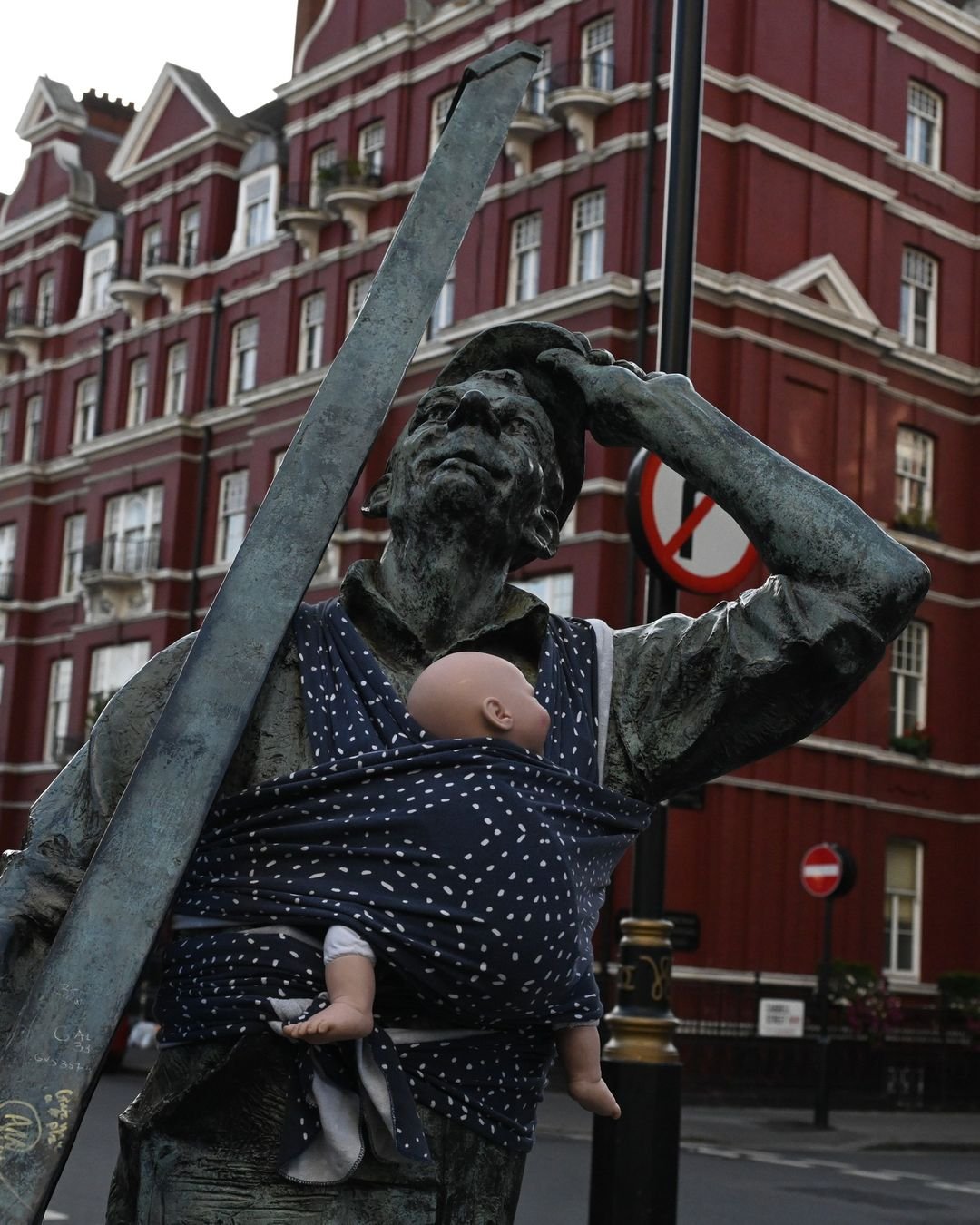 All over London and Edinburgh, the group has strapped toy dolls to the statues using colorful baby slings.