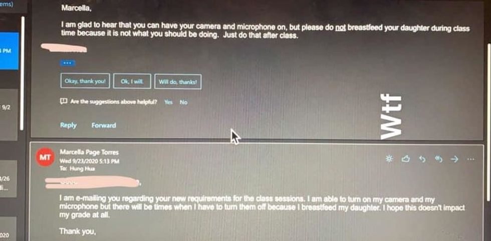 So Marcella asked the professor if she could turn her camera and microphone off if she needs to breastfeed during class. The instructor's response was a shock.