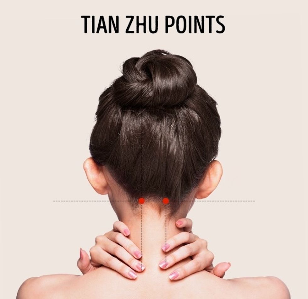 The Tian Zhu points (in the back of your head near your harline, at the beginning of the spine)