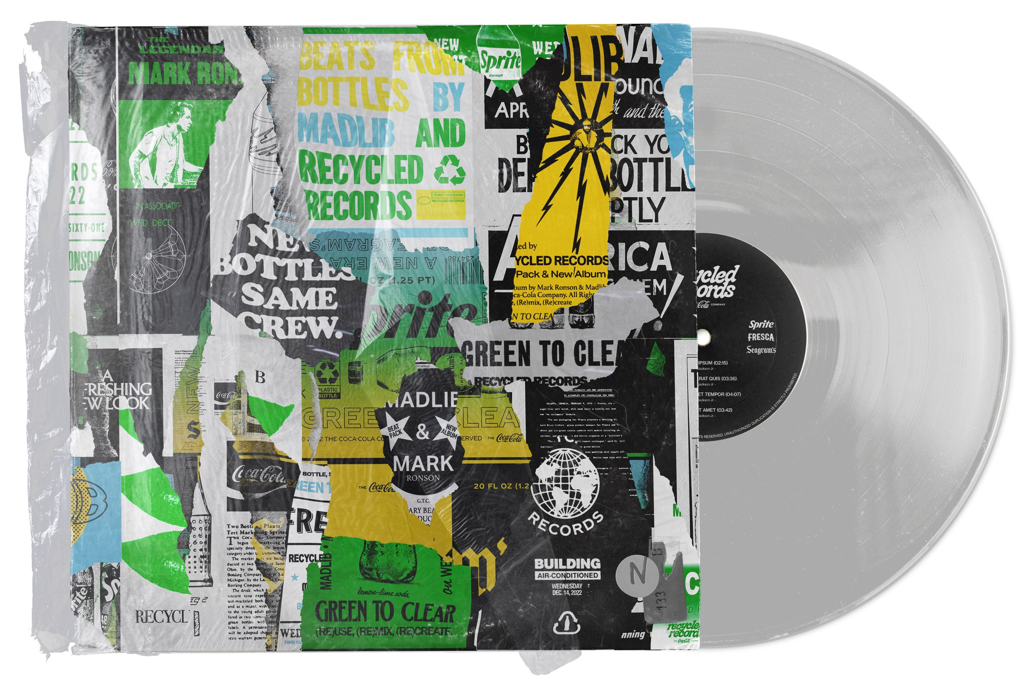 To celebrate the shift from green to clear, The Coca-Cola Company partnered with iconic, genre-defining/defying producers Mark Ronson and Madlib to create the world’s first album composed of the sounds of the plastic recycling process itself. The Recycled Records EP uses real ambient sounds sampled from various points in the closed-loop recycling chain at four different recycling facilities scattered across the United States. From the percussion of a forklift beeping, to the tonal beat of a conveyor belt, to the hi-hat of air blown into a plastic bottle, the EP brings to life the magic of multiple reuses.