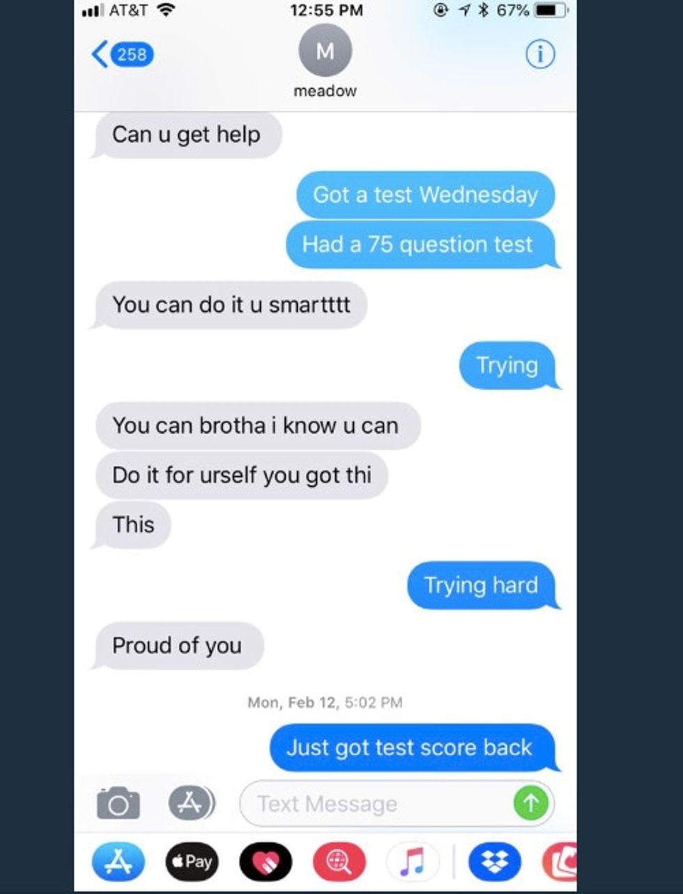 A few years ago, whenever Hunter found himself in these situations, he could always count on his sister, Meadow. Her encouragement, often in the form of inspirational text messages, helped him get through times of self-doubt and overwhelming stress.