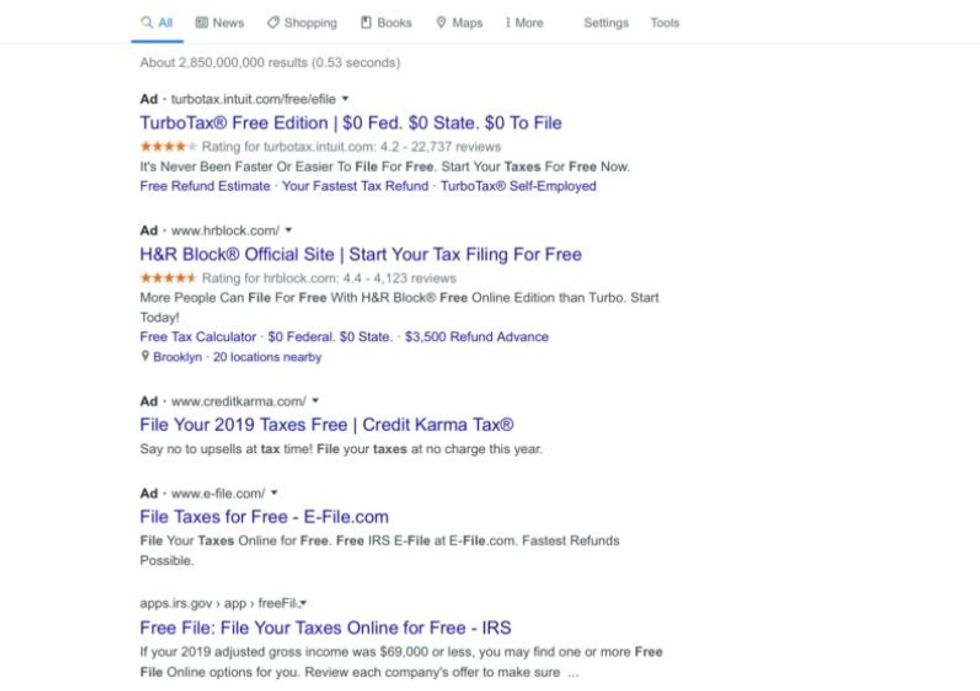 As a result, companies like Intuit, whose TurboTax is the top tax prep software, continue to confuse some customers who seek free tax prep into paying. Today, Google searches for "free tax filing" and other similar phrases still yield ads for a plethora of products such as TurboTax's "Free Edition" (its ads promise "100% Free Tax Filing"), which lead customers to pay fees if they don't have simple returns.