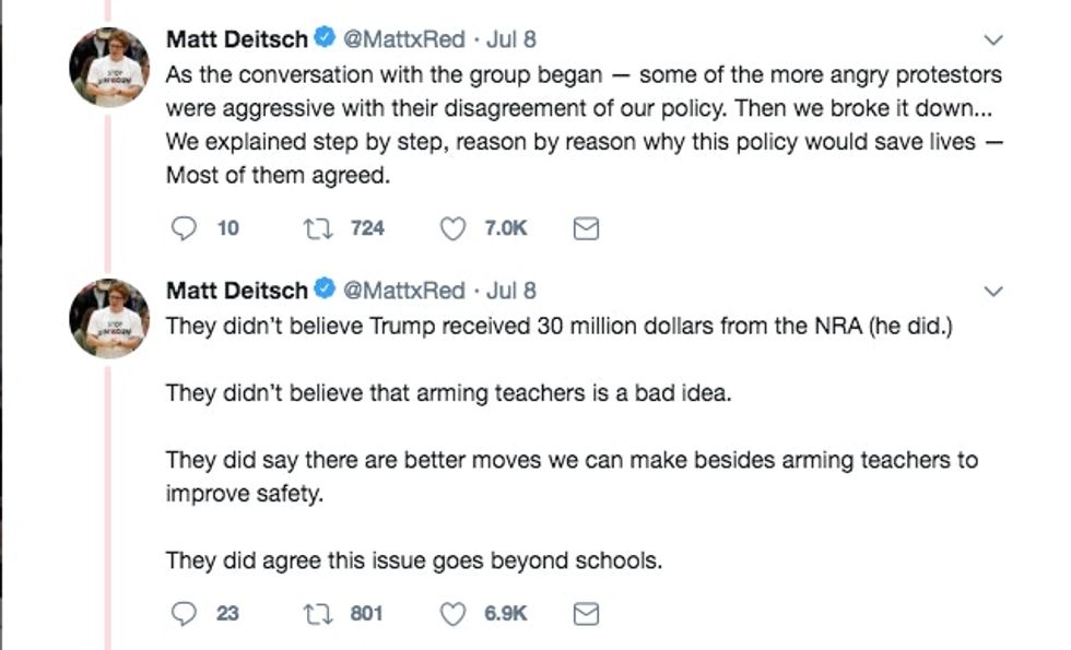 Fellow Parkland survivor Matt Deitsch chronicled the exchange on Twitter, noting that after one of the protesters began talking with Hogg, a few others approached and joined what turned into a 90-minute conversation.