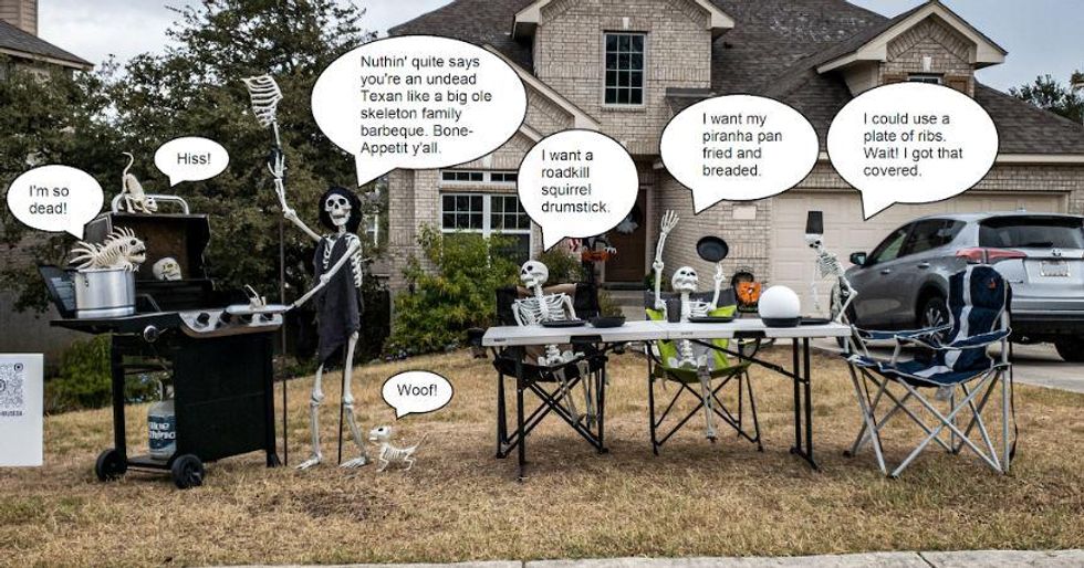 Hood: "Yes! Before the Halloween skeleton war started, they had just moved in and we didn't know them. We've been in our home for a couple of years now. Now, we talk to them almost every day!"