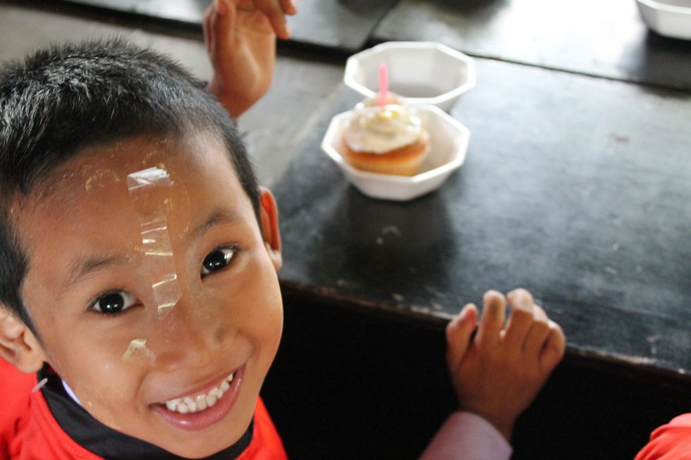 For three days, we throw birthday celebrations for about 430 kids, ranging in age from preschool to high school. I note that most of the kids wear some sort of school uniform, but some have put on their best dress-up clothes for the occasion. Most also wear a traditional skincare product called thanakha—a paste made of ground tree bark that's used as a sunscreen and skin softener—on their faces. Burmese people of all ages wear thanakha daily, a distinguishing feature that makes them stand out in Thailand.
