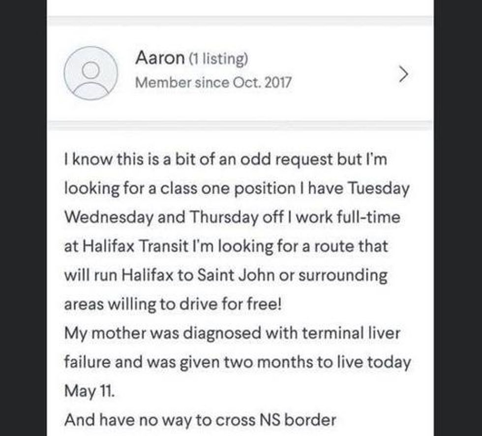 "My mother was diagnosed with terminal liver failure and was given two months to live today, May 11, and I have no way to cross NS border," he added, signing off with his phone and email address.