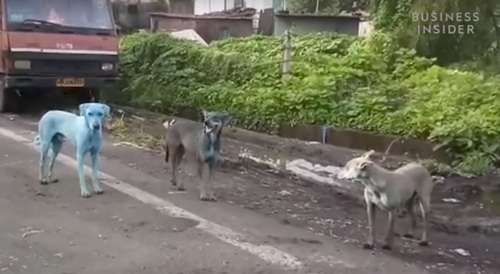 These dogs are from the city's Taloja industrial area, which is home to nearly 1,000 different pharmaceutical and industrial factories. According to the Navi Mumbai Animal Protection Cell, one of the companies has been illicitly dumping blue dye into the local Kasadi river. When the dogs went in the water to look for food, they inadvertently gave themselves one of the trendiest new looks of 2017.