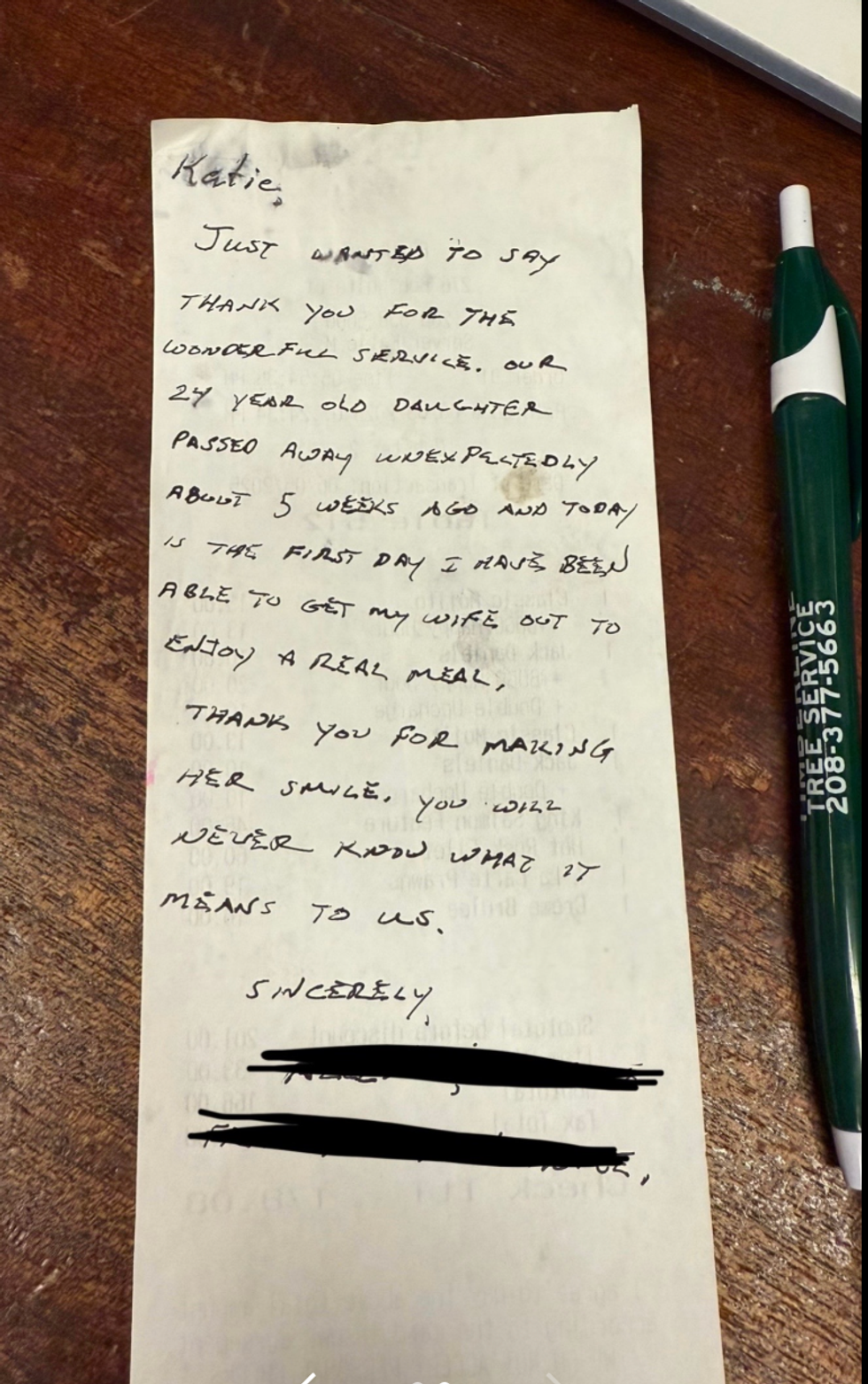 Twenty-five-year-old server Katie Miller certainly never would have anticipated that a seemingly ordinary conversation between her and a couple dining at her restaurant would lead to her getting a handwritten note that left her "sobbing mid shift.”