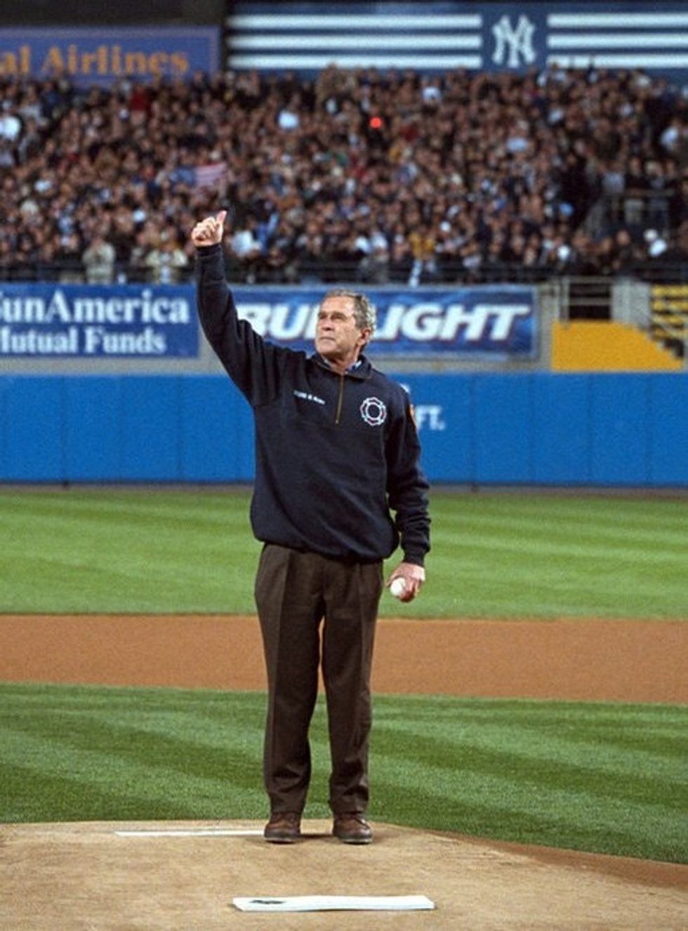 At the World Series in 2001 at Yankee Stadium, just weeks after the devastation of 9/11, President George W. Bush threw the ceremonial first pitch while wearing a bulletproof vest.