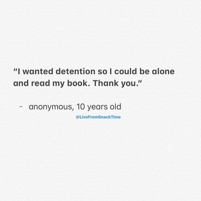 I’m seriously feeling this silver lining-finding 10-year-old who said, “I wanted detention so I could be alone and read my book. Thank you.” I AM A MOTHER OF THREE. PUT ME IN DETENTION, PLEASE AND THANK YOU.