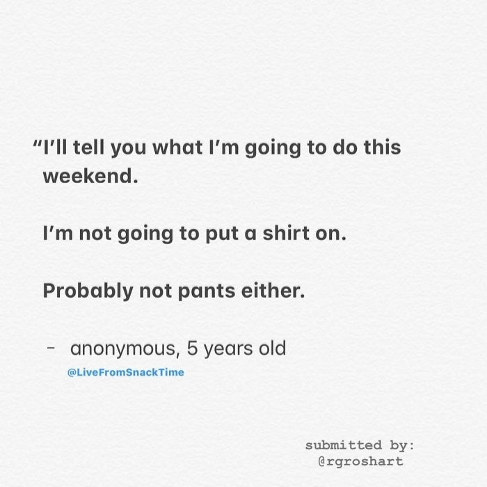 But nothing beats the realness of this 5-year-old sharing their weekend plans. “I’ll tell you what I’m going to do this weekend. I’m not going to put a shirt on. Probably not pants either.”