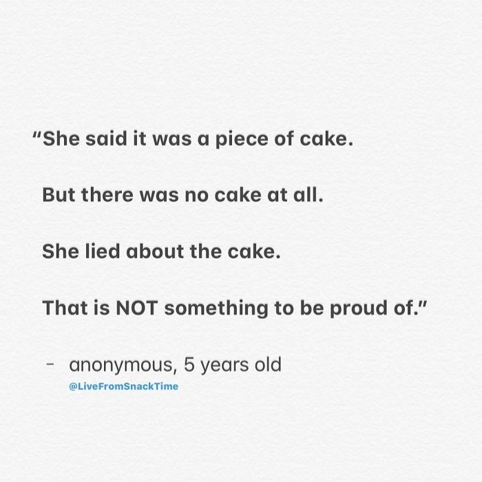 Sometimes kids are funny because they take everything literally. For example, the morally superior 5-year-old who didn’t understand the phrase “piece of cake”: