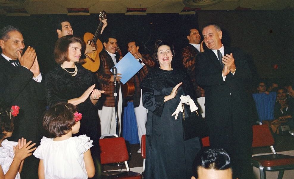 First Lady Jacqueline Kennedy, Vice President Lyndon B. Johnson, and Lady Bird Johnson applaud during a dinner held by the League of United Latin American Citizens (LULAC) at the Rice Hotel in Houston, Texas. Past National President of LULAC, George Garza, stands at far left; dinner attendees, Debbie Briones and Lisa Herrera, stand at left in foreground.