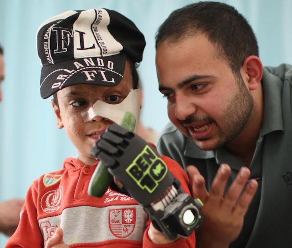The 6-year-old Yemeni boy sits next to Asem, a Syrian refugee who lost his leg as a paramedic in the war at age 19 and later became a prosthetic technician in Jordan. This photo was taken by Manar Bilal, the man who saved Asem's life. The two are now best friends. Photo by Manar Bilal, courtesy of Refugee Open Ware.
