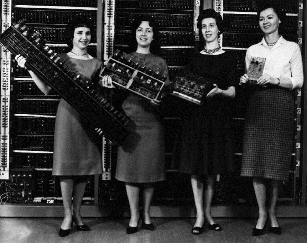 Working double and triple shifts six days a week, this ragtag crew of six female "computers" (which was a job title back then) lugged cables and trays between panels on the massive machine. Occasionally they even had to crawl inside it to fix faulty tubes.