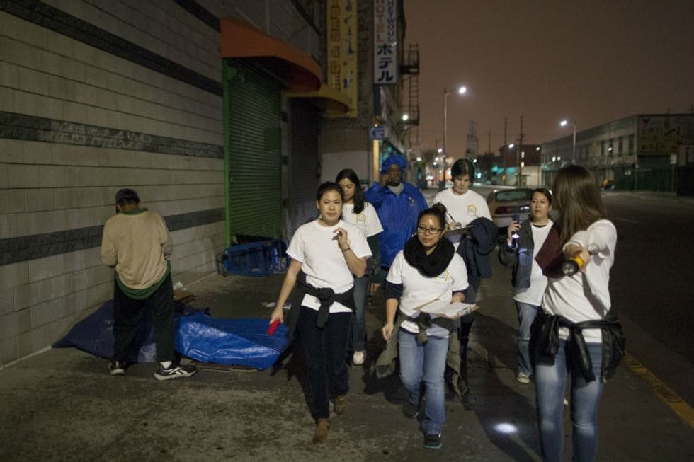 Volunteers count how many people are homeless in Los Angeles. Photo by David McNew/Getty Images.