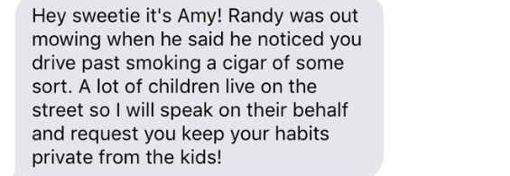 let amy know randy might run some kids over in his mower with his shitty eyesight