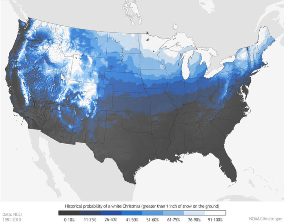 How do we know? It's thanks to the National Centers for Environmental Information's very cool (if you'll pardon the pun) white Christmas map. It shows the probability that any particular place in the lower 48 states will have at least an inch of snow on the ground (I mean, you try making a snowman with 1/16th of an inch) on December 25.