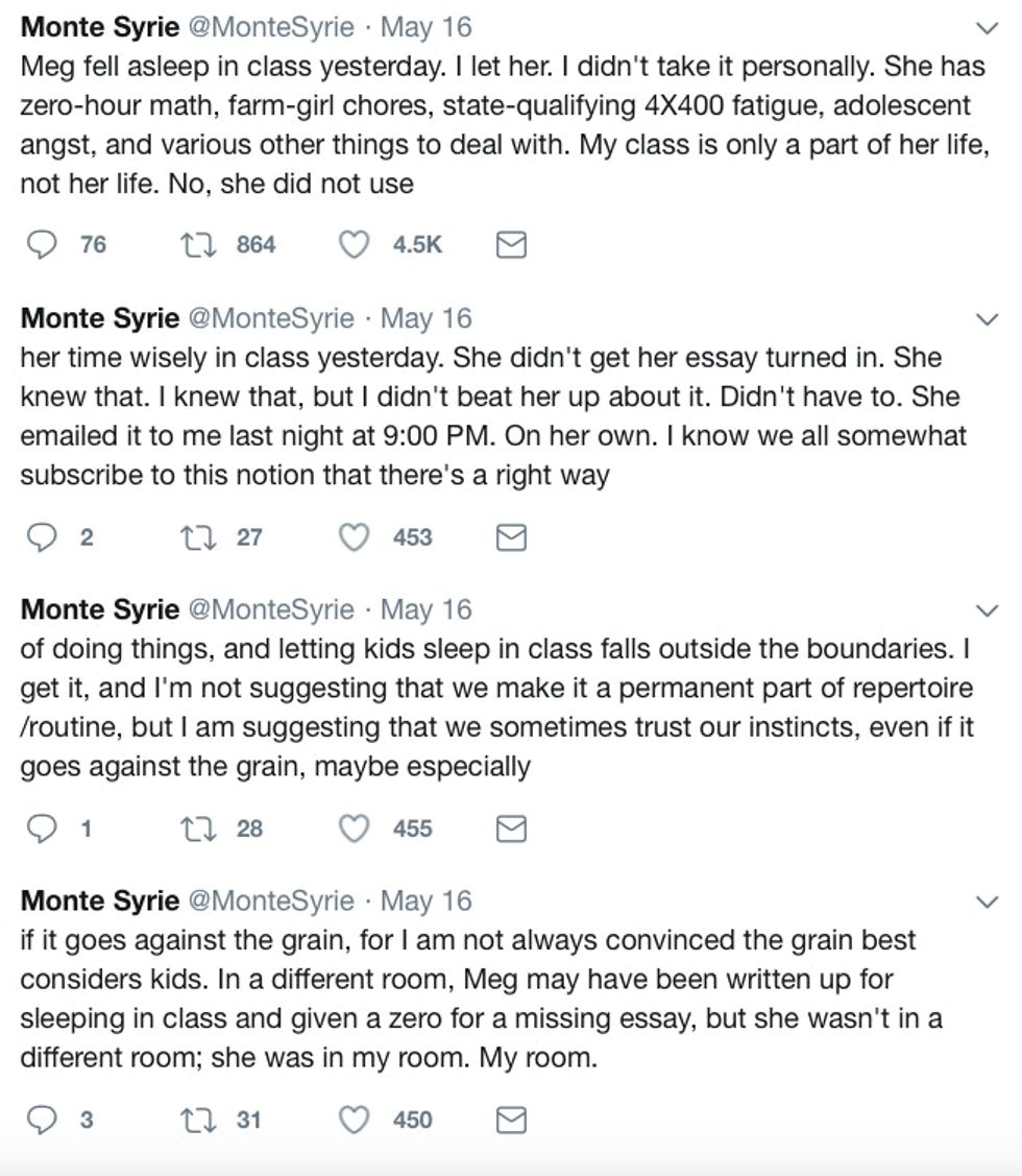 But high school English teacher Monte Syrie sees things differently. In a Twitter thread, he explained why he didn't take it personally when his student Meg fell asleep — and why he didn't wake her up.