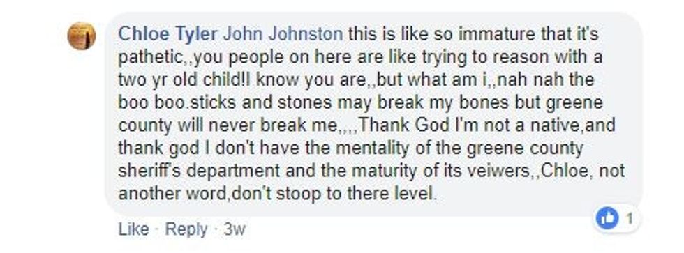 “Ms. Chloe Jones and her witty comments are taking a hiatus from our Facebook comments section due to the jail not having internet for her to use,” the sheriff's station wrote. “Thank you to the citizens of Greene County, Monongalia County and many others for your tips that lead to her arrest. Morgantown Police were able to take her into custody this evening.”