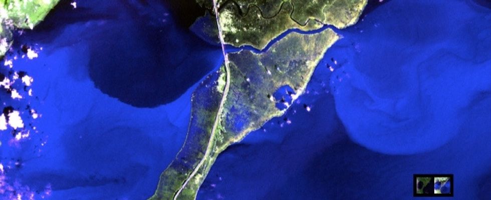 Rivers and streams often carry sediment with them. As they slow down and reach the coast, that sediment falls out of the water. Over time, this can create new land, as you can see above.