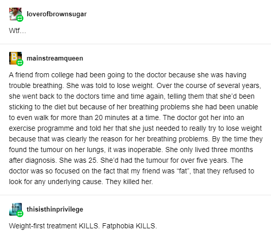 One person shared a story of a college friend who had been having trouble breathing. The doctor told her to lose weight. Time and again over several years, she returned to the doctor with the same breathing problem, telling them she was dieting but couldn’t exercise because of the breathing issue. It turned out she had a tumor on her lungs that wasn’t caught. She died at age 25, three months after it was finally diagnosed.