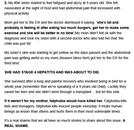 The pain got worse, the girl’s skin began to yellow. A third ER visit revealed she had life-threatening hepatitis, which took a year to recover from. “If it weren’t for my mother, fatphobia would have killed her,” the person wrote.