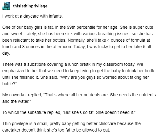 As the poster pointed out, “Thin privilege is a small, pretty baby getting better childcare because the caretaker doesn’t think she’s too fat to be allowed to eat.”