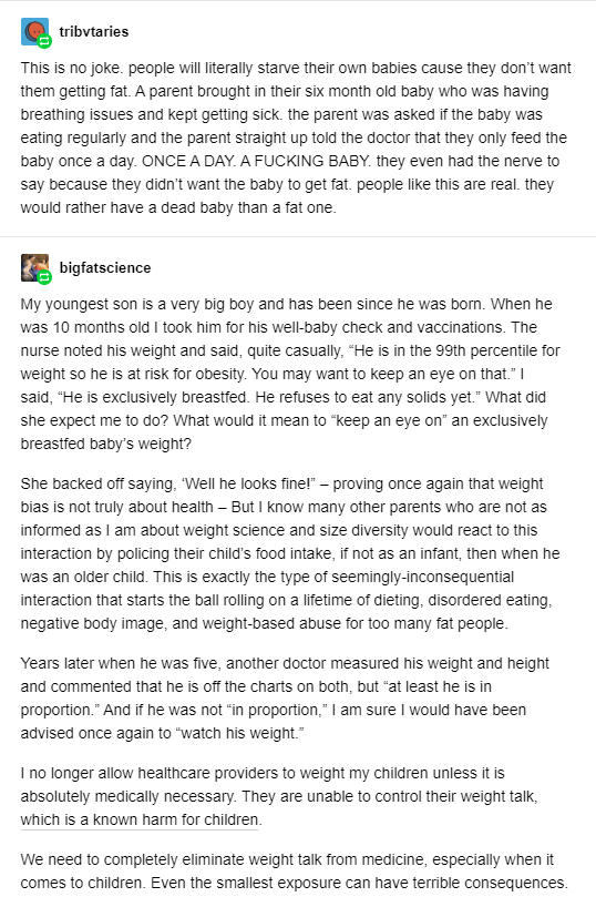 Other people chimed in with similar stories of babies being starved or evaluated as overweight.