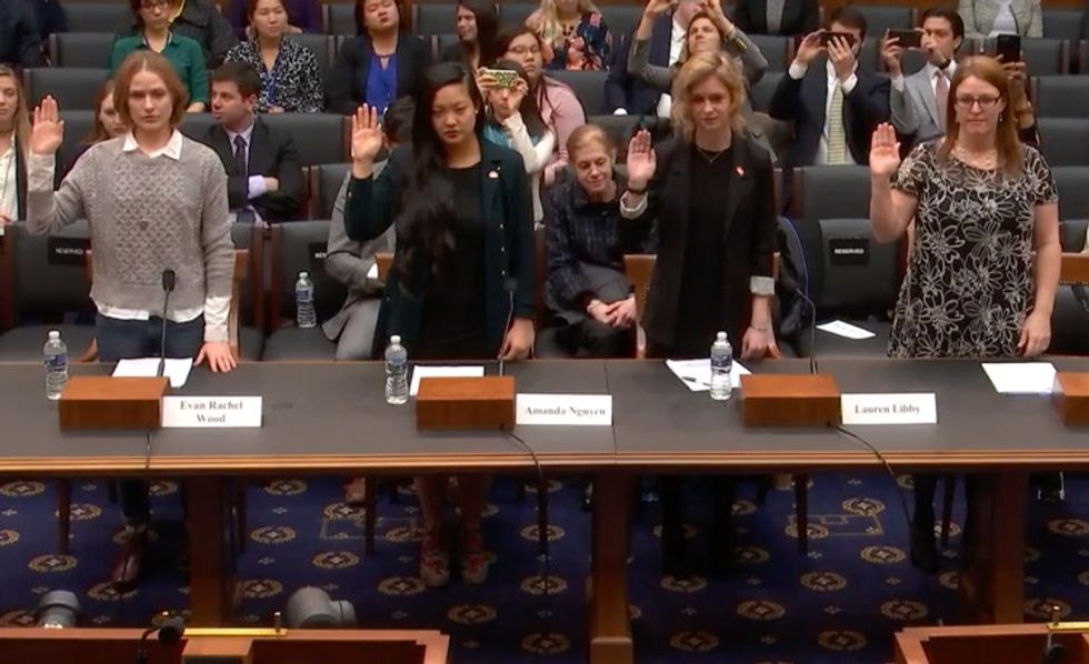 It was a bit of a "Ms. Wood Goes to Washington" type of moment. Joined by Rebecca O'Connor of the Rape Abuse and Incest National Network (RAINN) and Amanda Nguyen and Lauren Libby of the nonprofit Rise, the "Westworld" actress testified before the House Judiciary Committee. Together, the women brought their stories of pain and perseverance, advocating on behalf of survivors around the country.