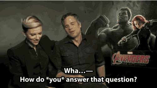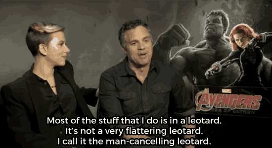 When she asked him if he had any special poses for the red carpet, the absurdity of the entire thing shined through. And when the reporter asked him if he had any special makeup tricks to help keep his complexion all shiny and classy, Scarlett asked him if he had to be painted green for any Hulk scenes.