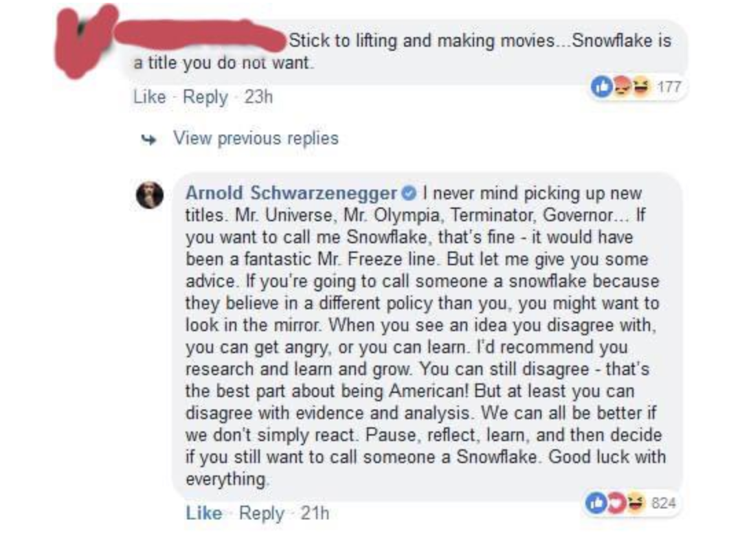 “I never mind picking up new titles. Mr. Universe, Mr. Olympia, Terminator, Governor… If you want to call me Snowflake, that’s fine – it would have been a fantastic Mr. Freeze line. But let me give you some advice. If you’re going to call someone a snowflake because they believe in a different policy than you, you might want to look in the mirror. When you see an idea you disagree with, you can get angry, or you can learn. I’d recommend you research and learn and grow. You can still disagree – that’s the best part about being American! But at least you can disagree with evidence and analysis. We can all be better if we don’t simply react. Pause, reflect, learn, and then decide if you still want to call someone a Snowflake. Good luck with everything.”