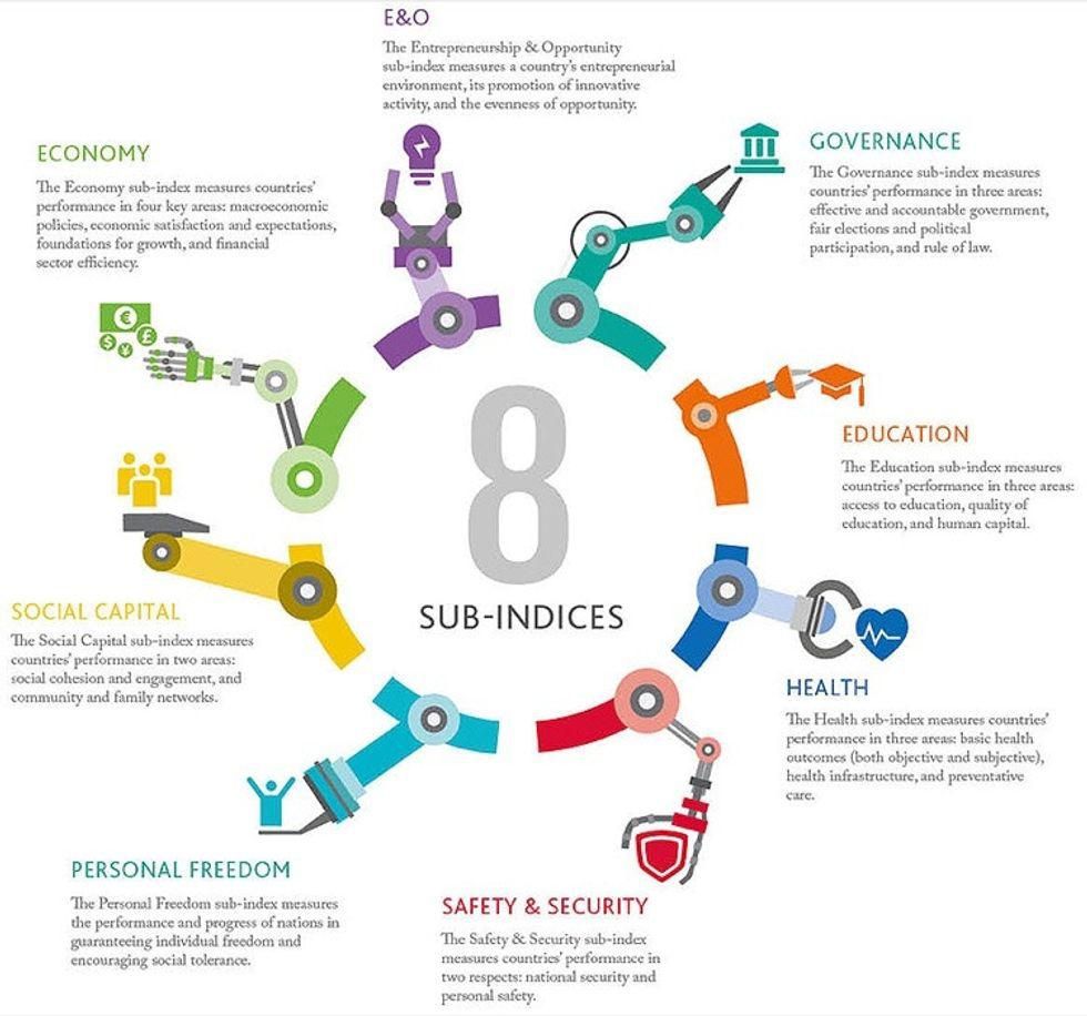 Each year, the Legatum Institute ranks countries on their Prosperity Index by measuring performance on eight subindices.