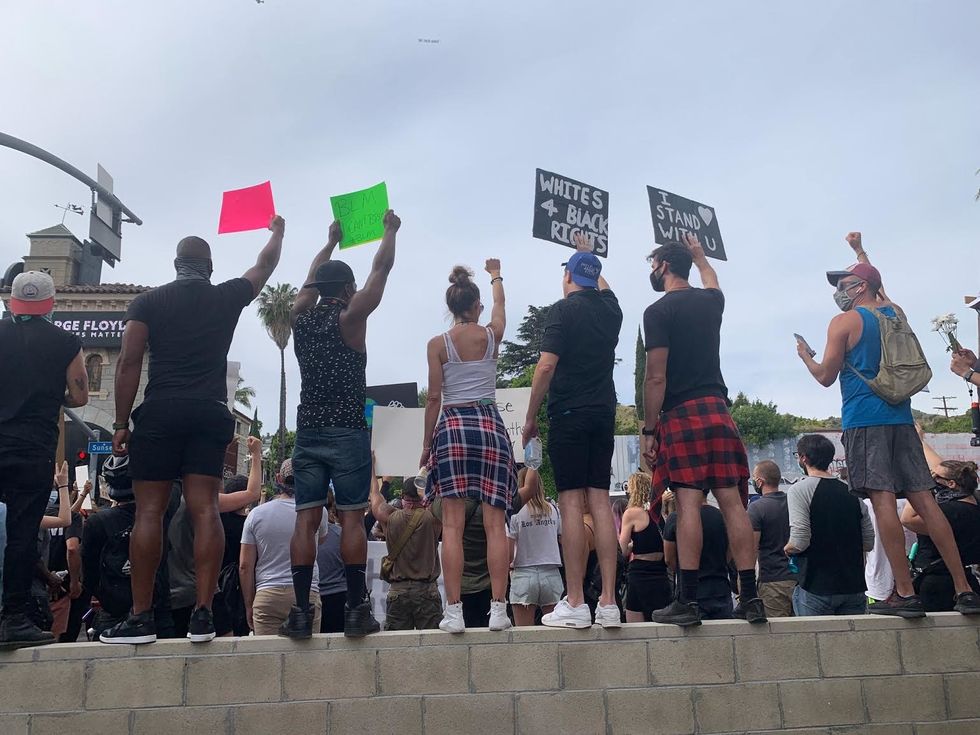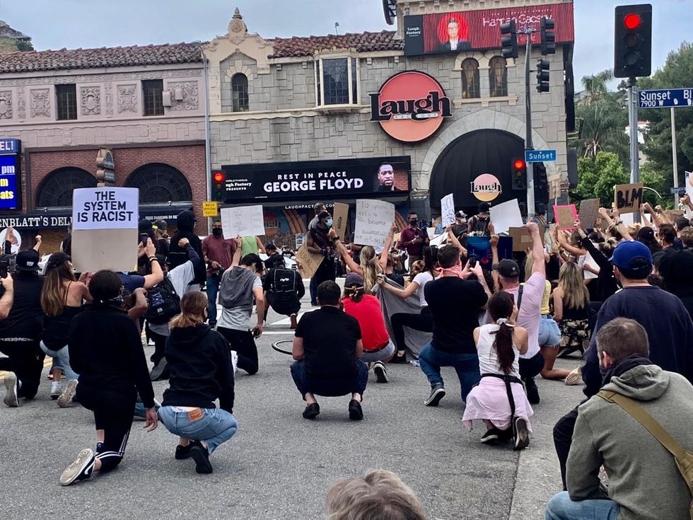 Commander Cory Palka marches through hundreds of protestors on Sunset Boulevard in West Hollywood, as they form around him in a circle. On his uniform, there's a sticker with a peace sign drawn in black marker. As he begins to speak, the leader of the protest hands him a megaphone. The crowd falls silent and he addresses them: "We do not want enemies. We do not want to go against you. I will acknowledge the tragedies that have occurred throughout this country regarding racism and the police. I'm trying to express my heartfelt pain that you feel. Please listen to my heart. We do not want to come in here and be aggressive and firm," he says. "We want you to peacefully protest."