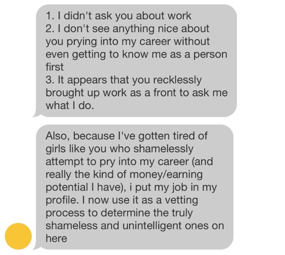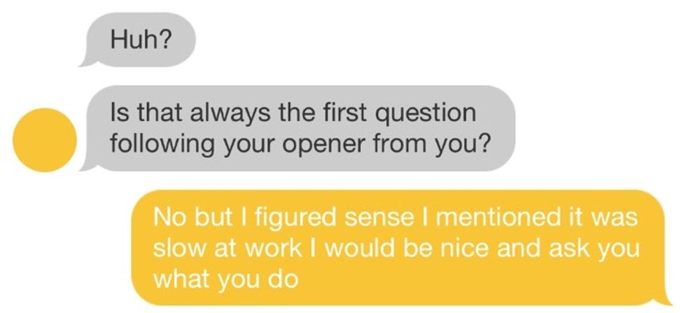 "The entire exchange made our skin crawl," a Bumble spokesperson told Upworthy. "He so blatantly represents the misogynist voice that argues against equality, and in turn, holds back anyone wanting to be treated as an equal. We feel like, as a society, we should be past the point of sexism. We know as an app, we can only do so much, but we are taking every opportunity we can to have a cultural impact and shed light on the right way to treat people."