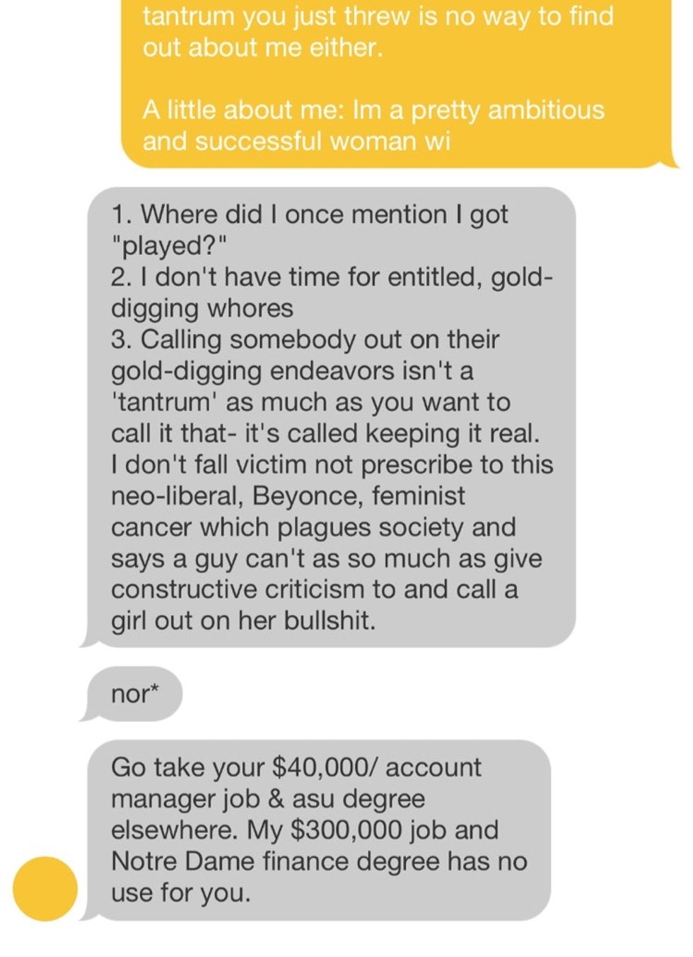 Whoa, buddy! Later in the conversation, he called her an "entitled, gold-digging whore," and accused her of pushing "this neo-liberal, Beyonce, feminist cancer which plagues society" on him before putting her down for presumably making less money than him.