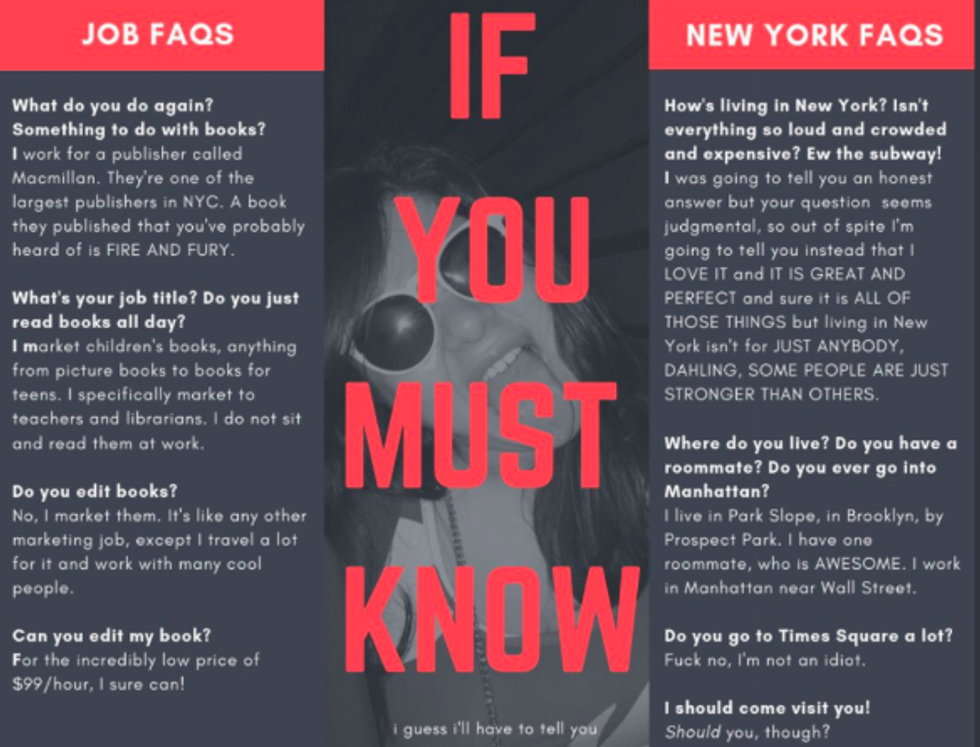 After joking with her coworkers about making a personal brochure to hand out at her cousin's wedding, Croce committed to the bit and created a hilarious pamphlet explaining what her job does, why she's single, and all the FAQ about living in NYC.