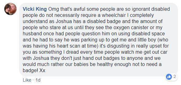 I knew something would be said one day as every day I get looks and stares and see people whispering to each other about me and Bobby walking from the car. Everyone needs to stop and think before acting. I hardly ever let anything upset me but this did. How aggressive as well, and as for conning my son’s disabled pass… [It] is not a con, he’s actually seriously ill. I’ve added a picture of him to prove not everyone looks ill or disabled but can be seriously ill.