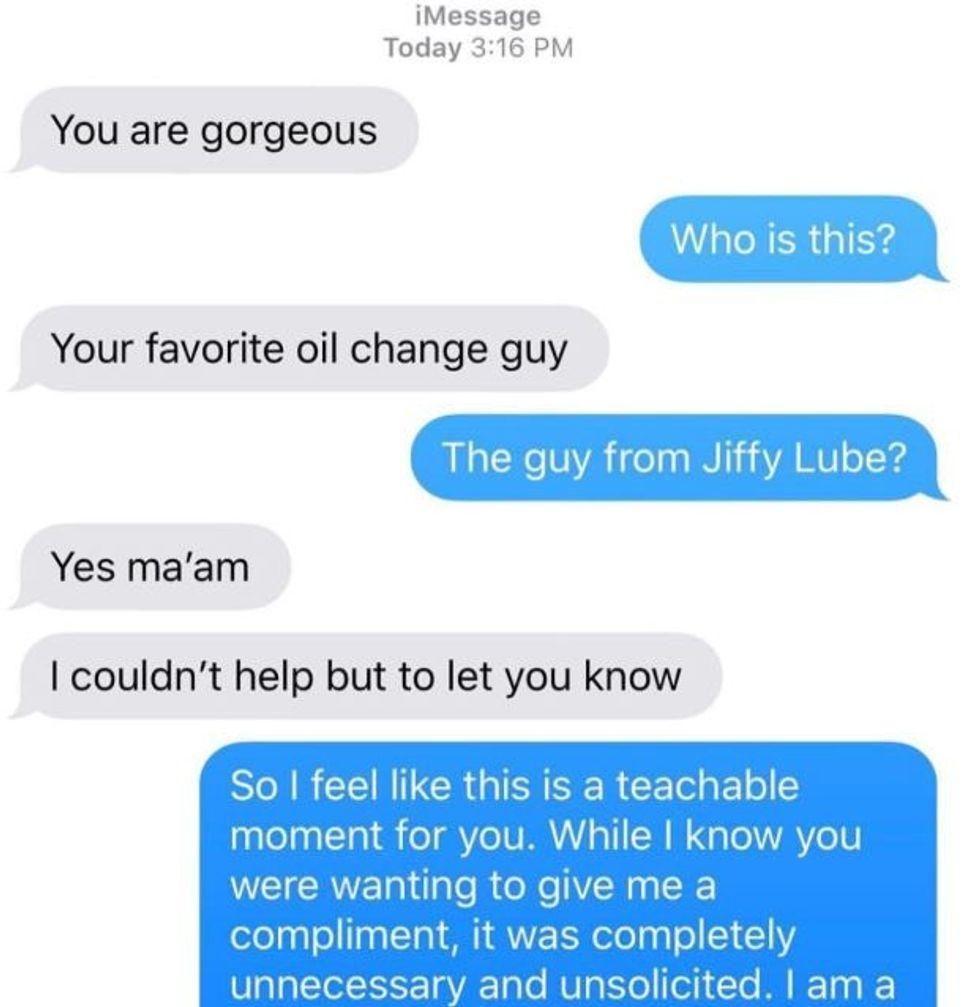 Woman turns creepy text from Jiffy Lube guy into incredible 'teaching moment'