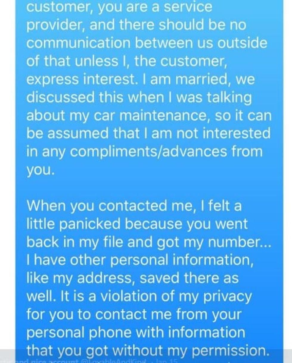 “While I know you were wanting to give me a compliment, it was completely unnecessary and unsolicited," she replied. “I am a customer, you are a service provider, and there should be no communication outside of that unless I, the customer, express interest."