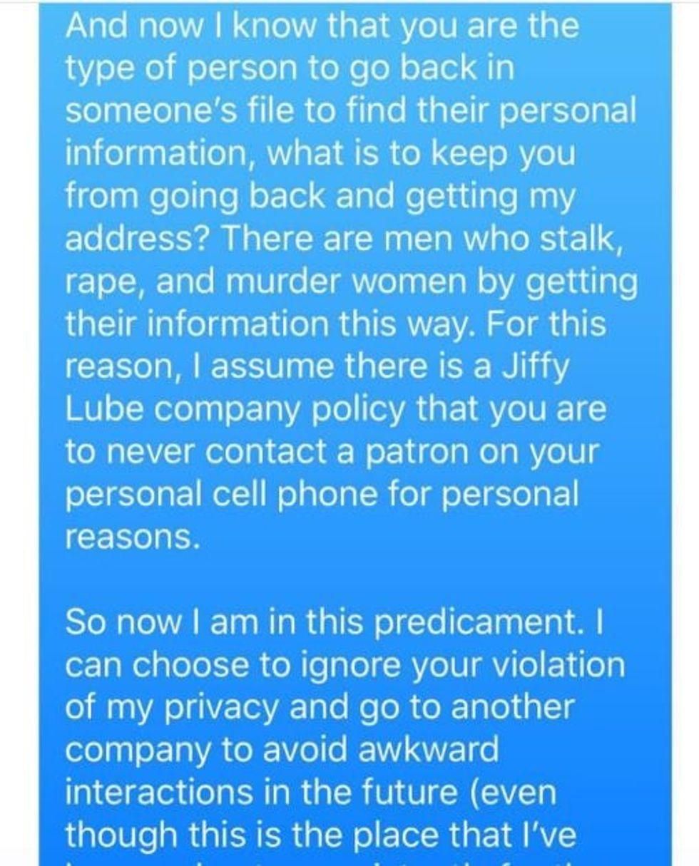 She then wrote that she could call Jiffy Lube human resources to report his actions, but she'd rather he learned from the incident.