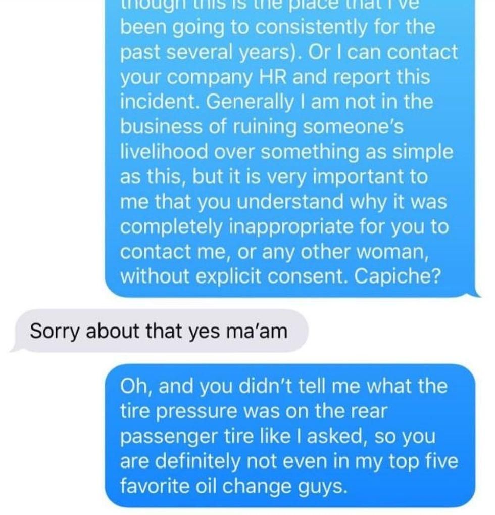 “Oh, and you didn't tell me what the tire pressure was on the rear passenger tire like I asked, so you're definitely not even in my top five favorite oil change guys," she wrote.